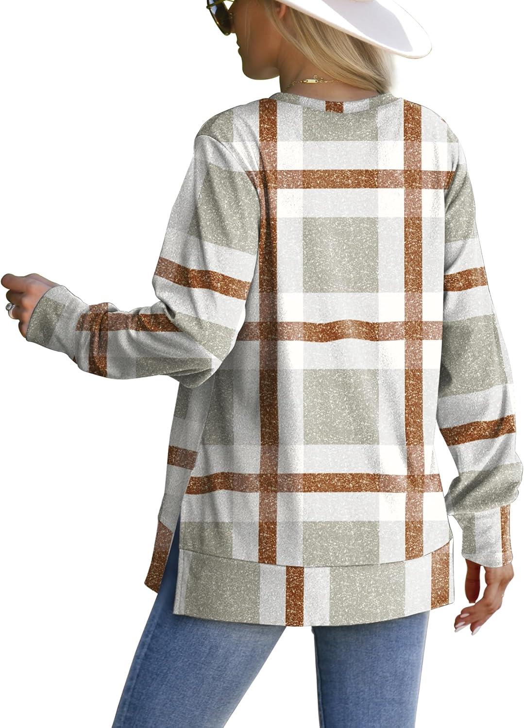 Saloogoe Sweatshirt for women Side Split Fall Fashion 2025 Long Sleeve Shirts Trending Now(Plaid Khaki)