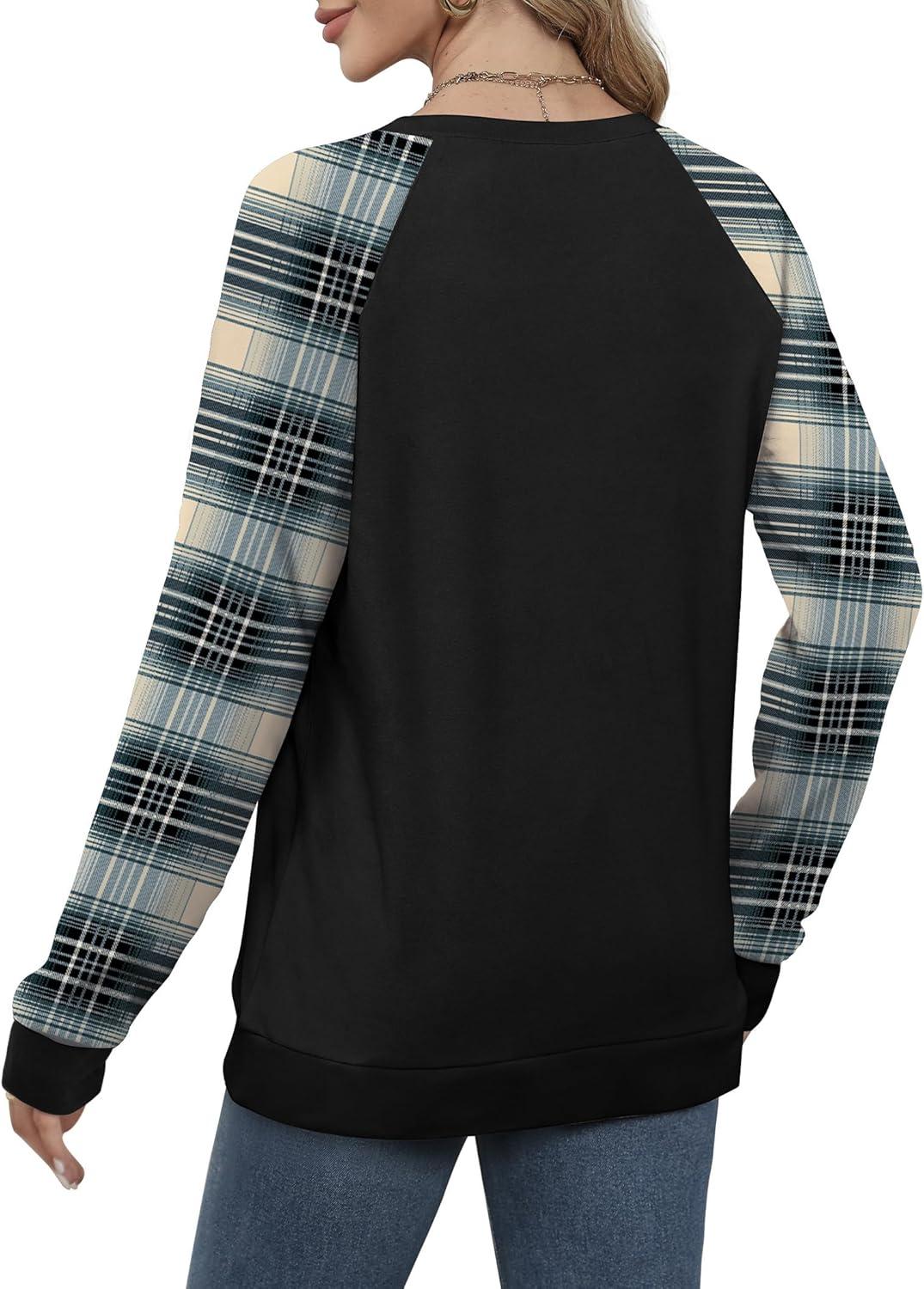 Saloogoe Sweatshirts for Women Crewneck Cable Knit Sleeve Sweaters Lightweight Fashion 2025(H-plaid Black)