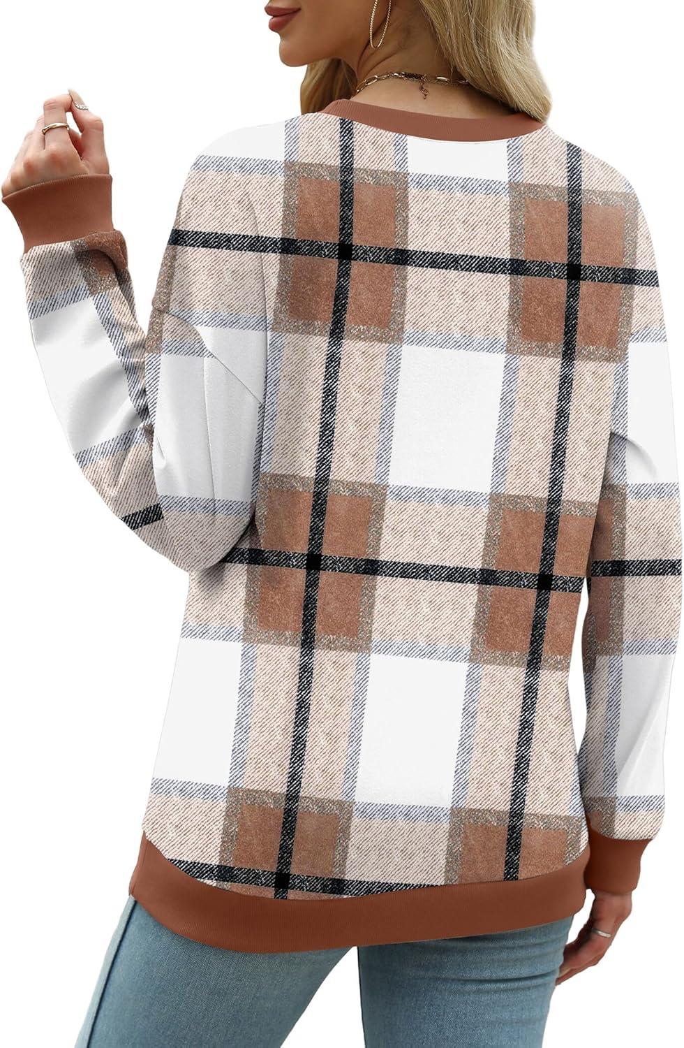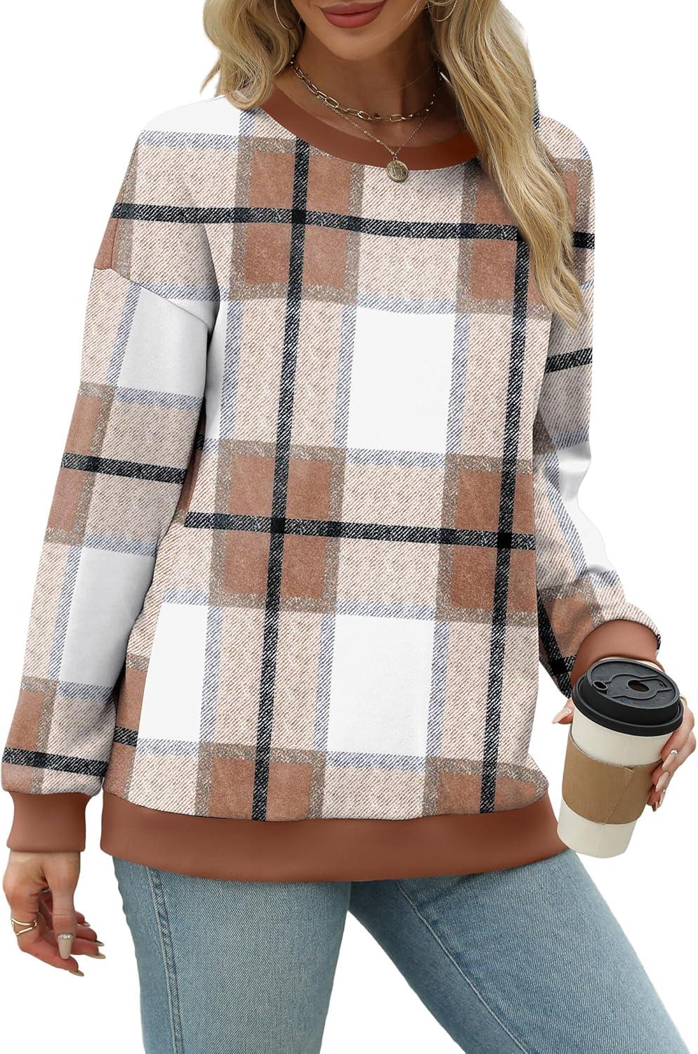 Saloogoe Sweatshirts for Women Crewneck Long Sleeve Loose Fit Tops Color Block Ribbed Trim Fashion 2025(G-plaid Yellow)