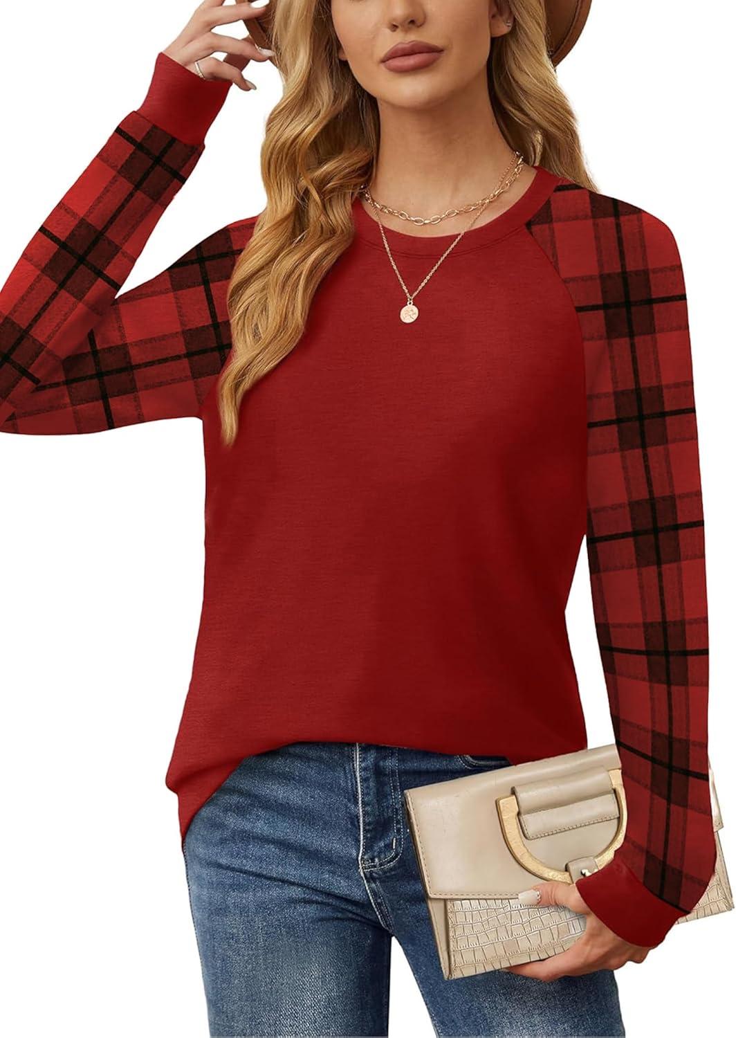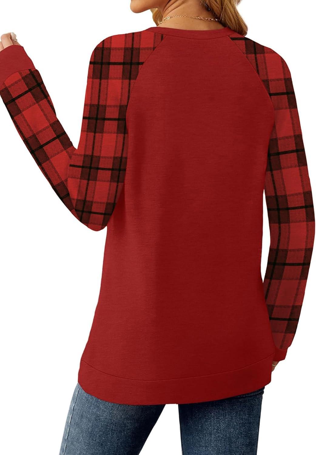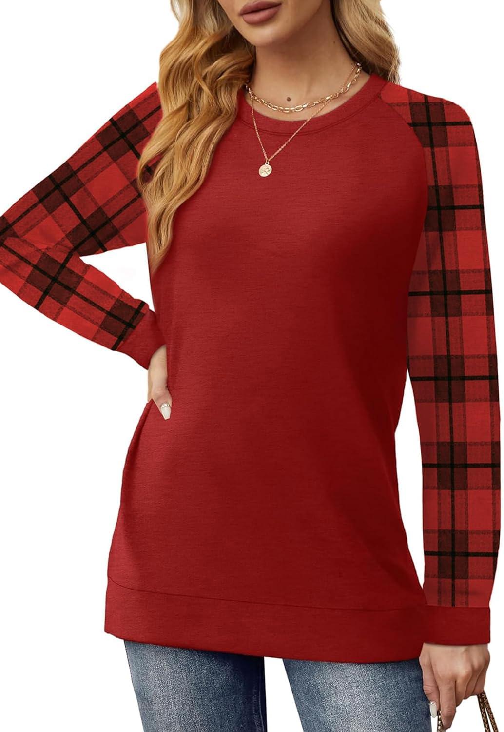 Saloogoe Tunic Sweatshirts for Women Crewneck Lightweight Sweaters Raglan Long Sleeve Shirts Fall Fashion Tops 2025(Red Plaid)