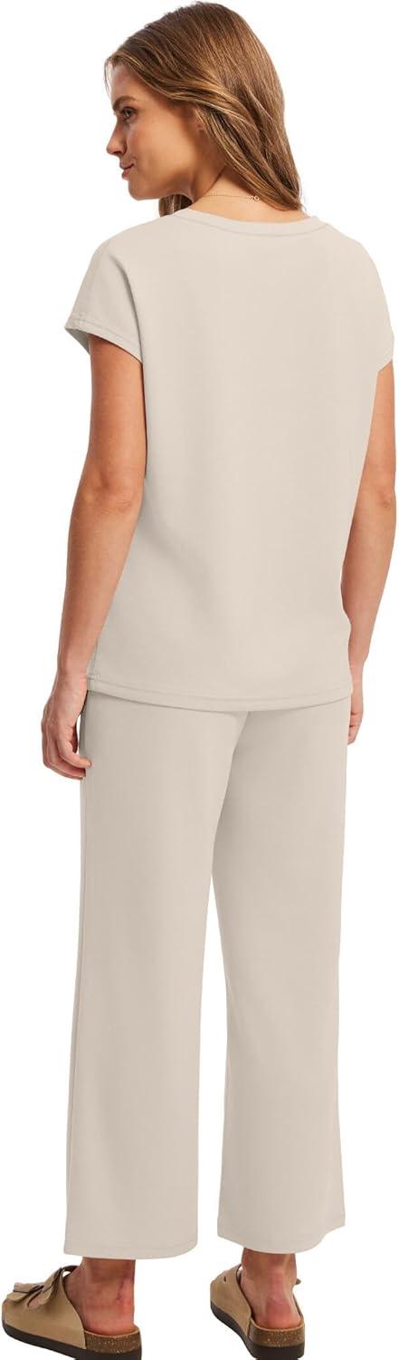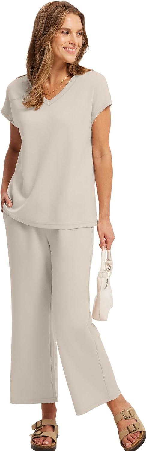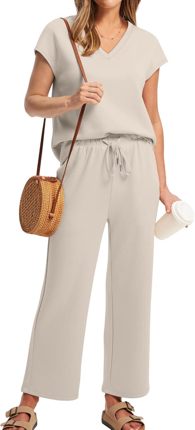 Saloogoe Two Piece Sets for Women Summer Outfits Lounge Sets V Neck Tops Wide Leg Pants Woman Vacation Travel Outfits(Beige)